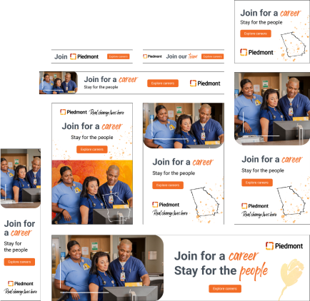 The goal was to create a Georgia-infused, research-informed identity designed to set Piedmont’s career site apart, along with subsequent creative recruitment marketing deliverables. Working closely with the Piedmont team, Appcast’s strategists, writers, and designers created a flexible messaging system that can be tailored to show Piedmont’s culture and job opportunities to candidates across multiple roles. By showcasing Piedmont’s Georgia locations and mission, the organization was able to increase visibility across future talent pools in the area.
