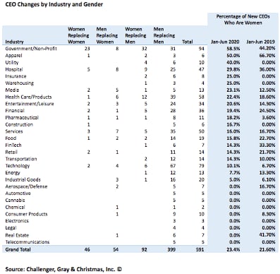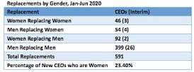 Of 591 replacement CEOs recorded in the first half of 2020, 138 or 23.4% were women. This is up from 21.6% of female CEO replacements in the first half of 2019 and 18.6% in the first half of 2018.