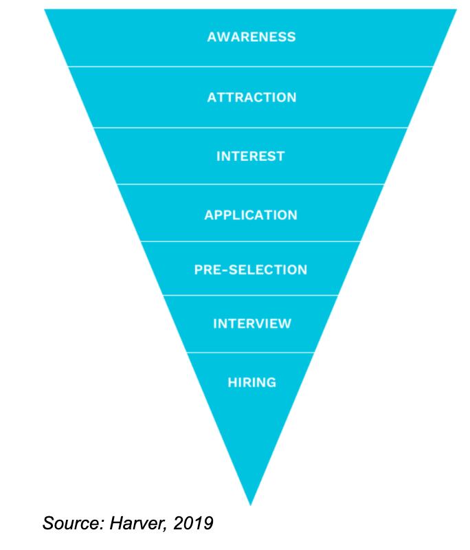 The apex of all data-driven recruitment is rooted in the recruiting funnel because it provides a framework for measuring, understanding, and improving the performance of your recruitment strategy. There are many versions of the funnel, and many organizations will have their own flavor of it, but in essence it is built to chronicle the candidate journey from job seeker to hired employee. It looks something like this: