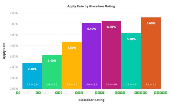High-performing companies have the highest average rating and recommendation over 2 years. Similarly, employers with between a three and five-point Glassdoor rating attracted more candidates on job ads than those with lower ratings, as shown in the graph below.