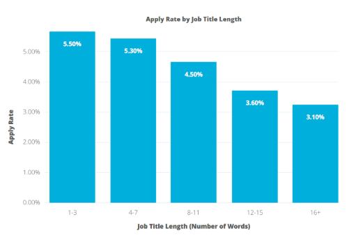 - Shorten your job titles: Job ad titles with between one to three words had the highest average apply rate of 5.5 percent, whereas job titles with between 12 – 15 words had a mere 3.6 percent apply rate. Similarly, job titles with one to three words had the highest percentage of clicks per job compared to jobs with longer titles.