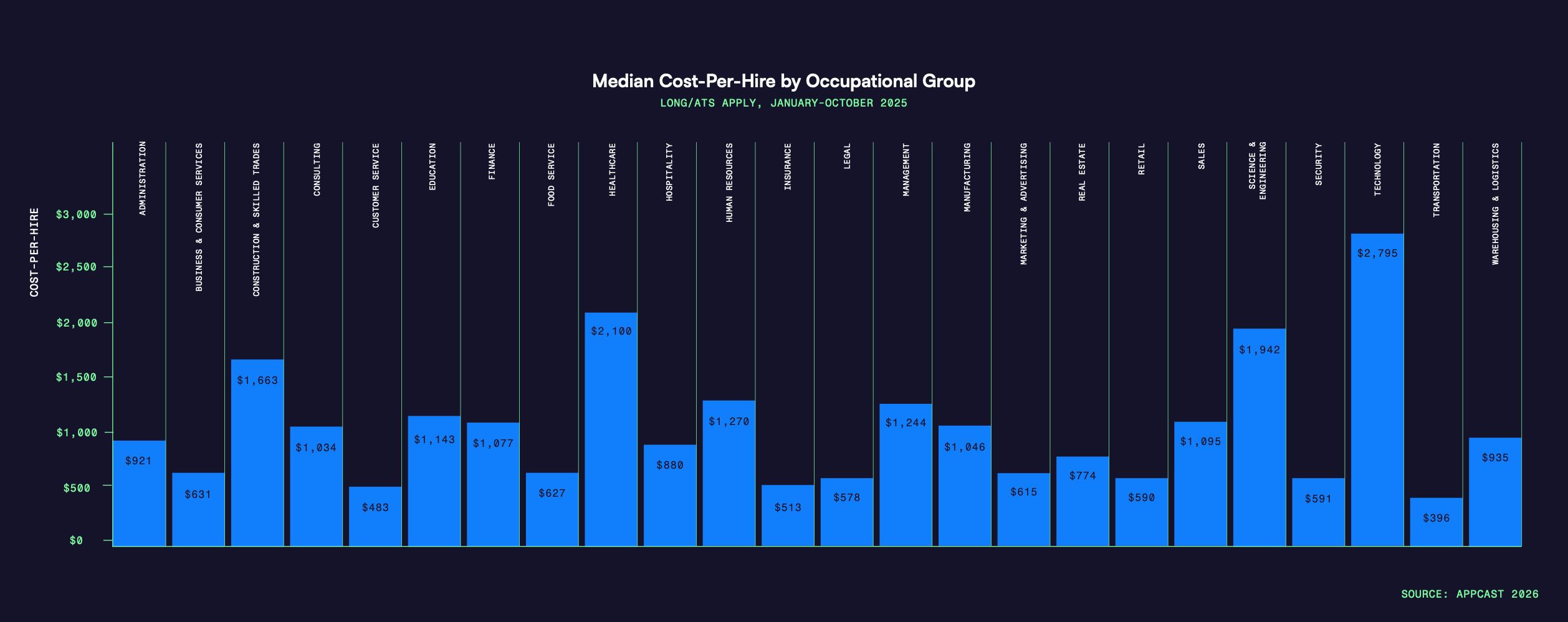 Healthcare recruiting has always been uniquely challenging, but in 2025, it became its own universe. Apply rates dropped while cost-per-click (CPC) and cost-per-application (CPA) rose. And cost‑per‑hire continues to sit at the very top of the occupational landscape.