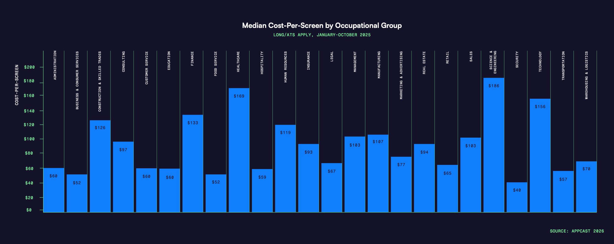 Healthcare has one of the highest cost‑per‑screen benchmarks. The reason is simple: Qualification requirements are stricter, and the number of candidates who meet them is small.