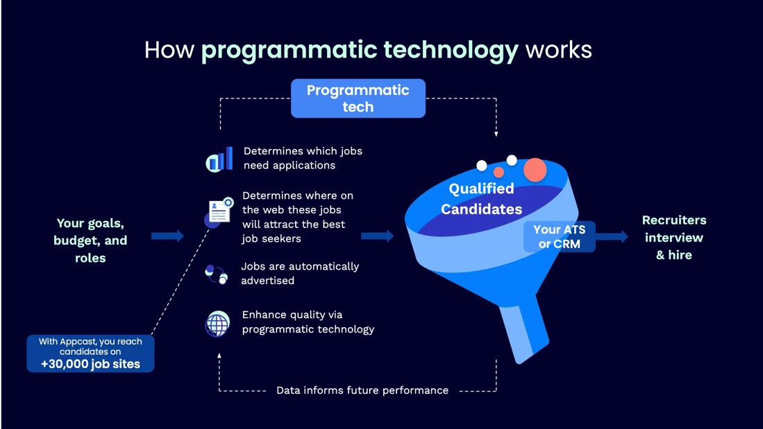 Programmatic technology optimizes the hiring process, using data to fill the bottom of your hiring funnel with quality candidates. Like any effective recruitment marketing strategy, different channels play a role in attracting talent to your organization: Programmatic job advertising gets the application and other channels – like search, social, or other online or offline media – will help engage, generate, and nurture the leads.