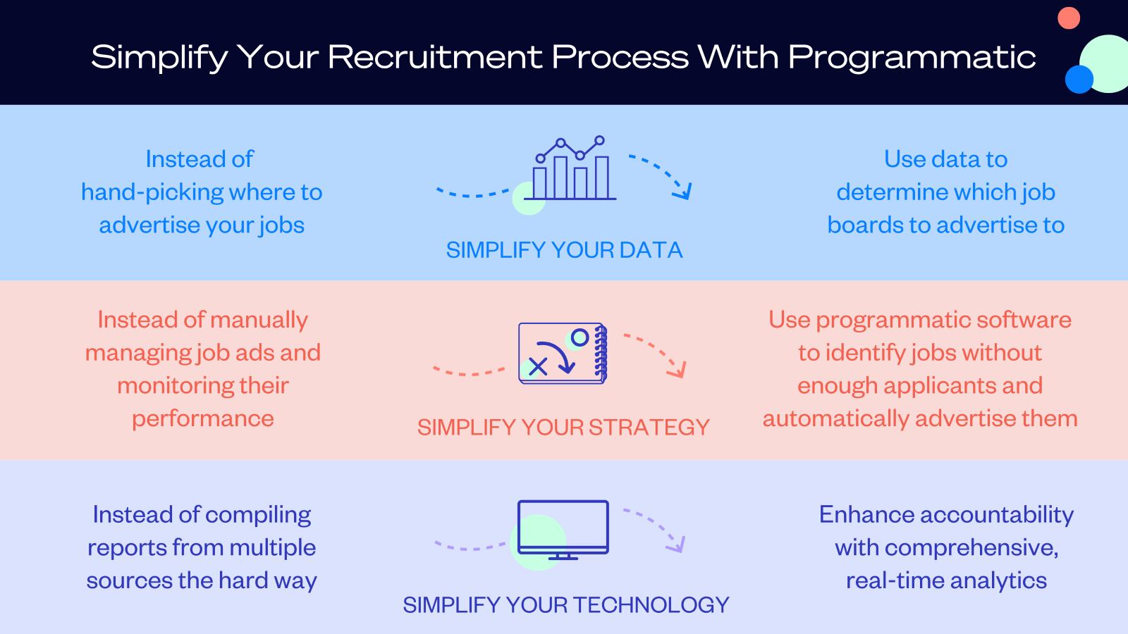 With programmatic job advertising, recruiting leaders no longer have to track the performance of multiple job boards because the software does it for you! Programmatic software ensures the desired number of candidates on time and on budget. Most importantly, this technology tracks spending, keeping recruiters up to date on key recruiting costs and data like cost-per-application, cost-per-click, and apply rate, to understand if they need to revise their strategy to navigate a challenging labor market, or perhaps adjust job ad content to better reflect their target job seeker’s preferences! Recruiting leaders can rely on this visibility to feel confident in programmatic technology’s performance.