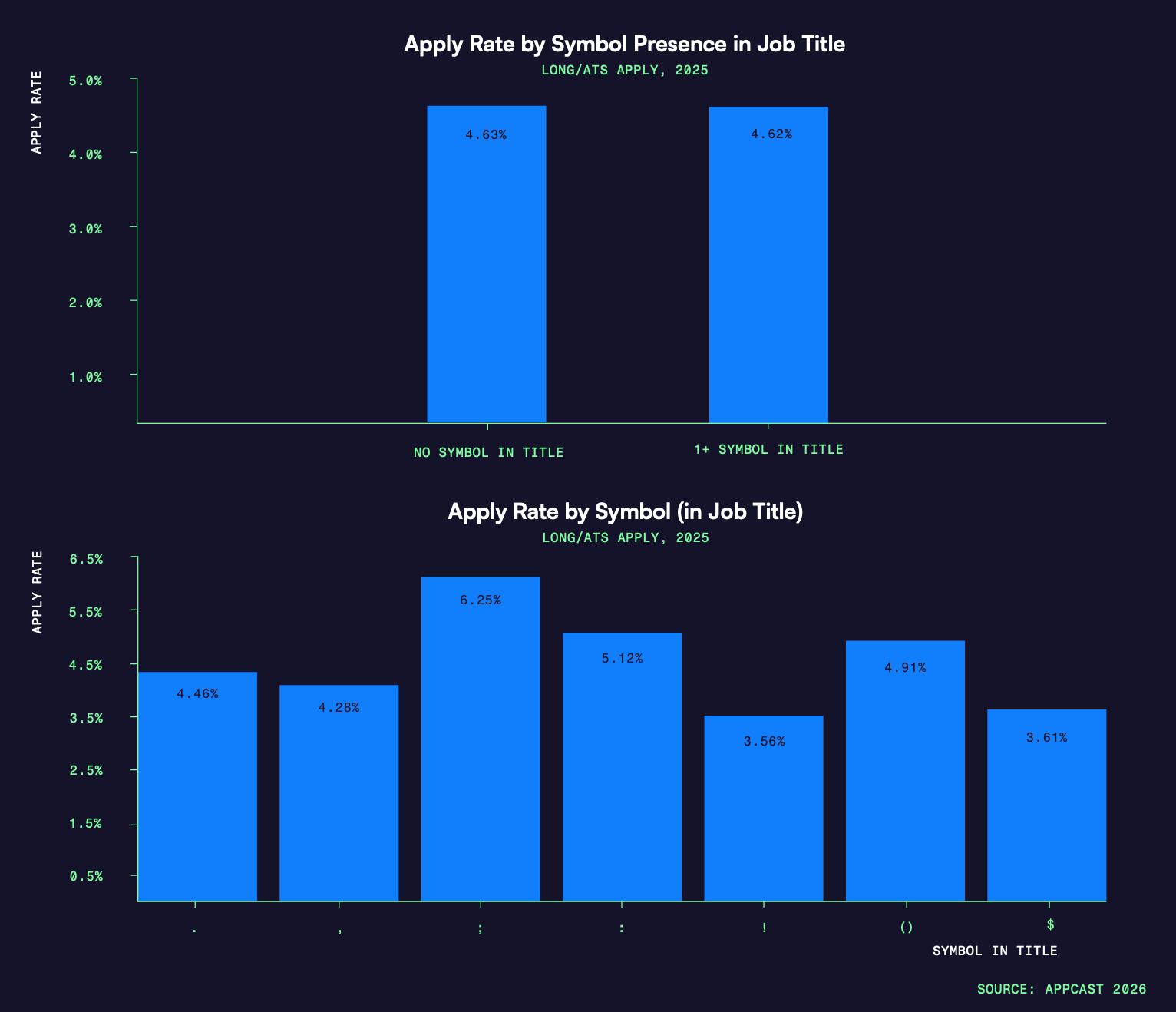 Last year, symbols clearly hurt apply rates. This year, the impact is more nuanced. Some symbols (like “$”) can uplift performance when tied to pay transparency, while others (“!”) can feel spammy.