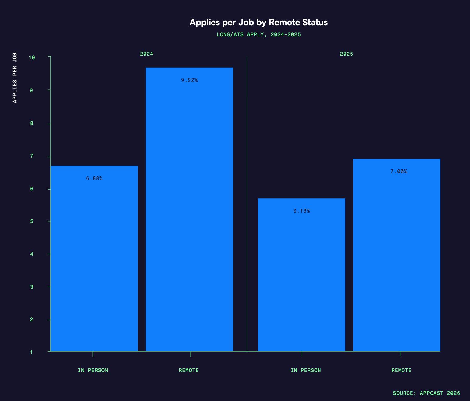 Apply rates still tick slightly higher for remote roles — but they no longer guarantee a flood of applicants.