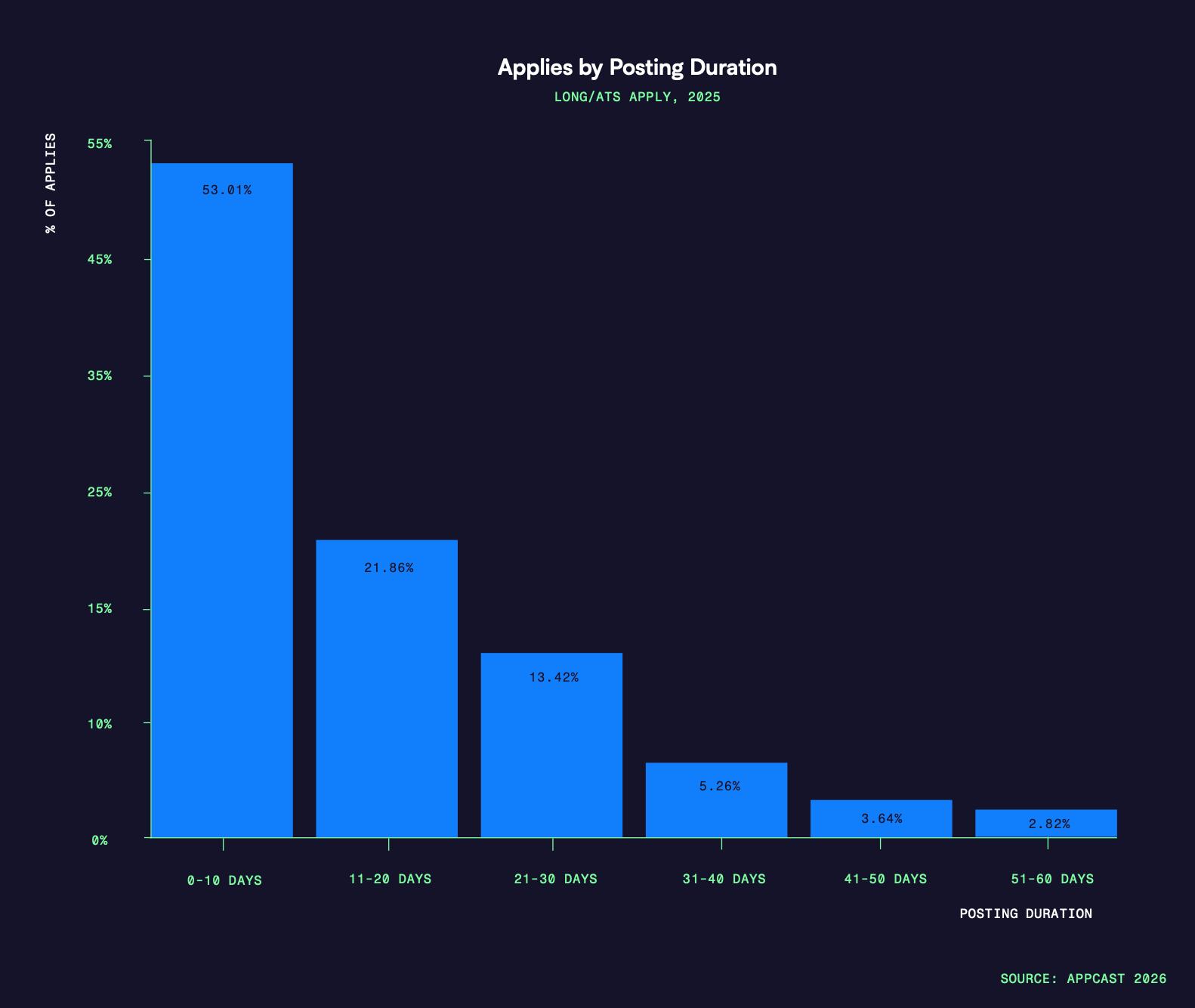 More than half of all applications arrive within the first ten days of a posting. After that window, apply volume drops quickly. Fresh content is prioritized on job boards, and job seekers favor newly posted roles.