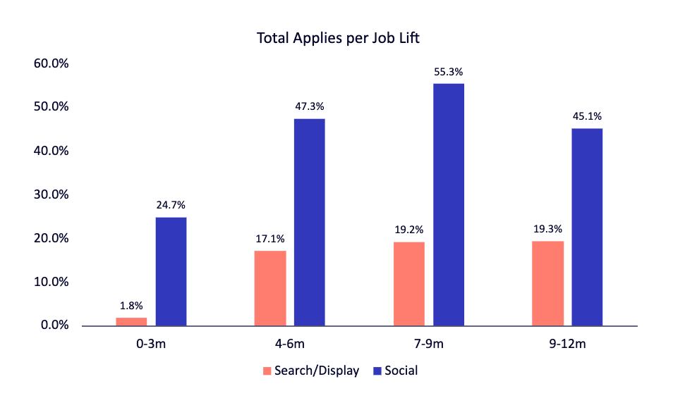 Appcast Brand Ads is not just about social channels, though. Appcast research shows that strategically layering social media into your recruitment marketing mix can drive longer-term impact of up to 55% lift in applies across all channels.