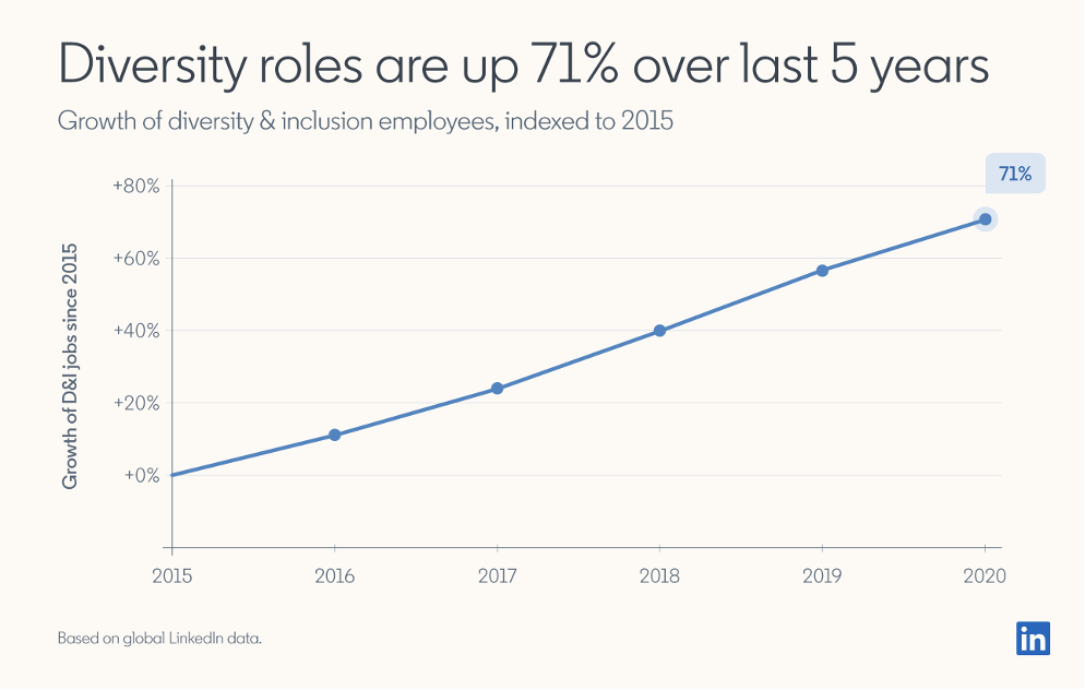 LinkedIn data shows a steady increase of employees in diversity and inclusion roles over the last five years.