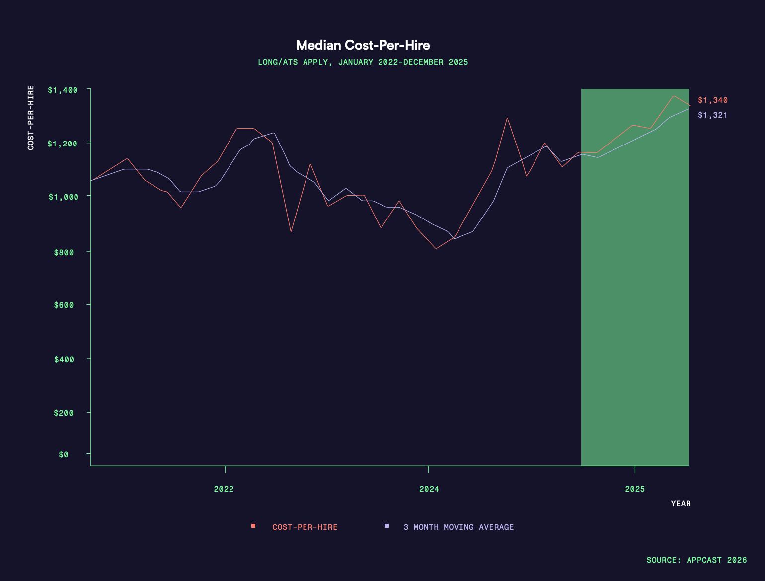 Even controlling for seasonality, 2025 was simply a more expensive year to hire. The soft labor market didn’t ease costs because cost drivers have shifted beyond labor supply.