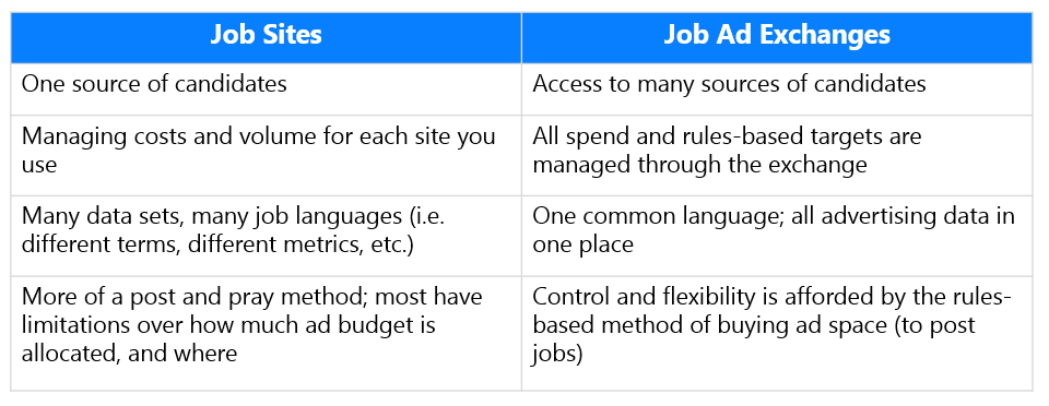 By definition, a job ad exchange is a digital marketplace comprised of different types of job sites, consumer sites, niche and social sites, where hiring organizations can advertise (what is recruitment advertising?) their open positions. Job ad exchanges use programmatic technology to purchase recruitment media (in other words, job postings) based on market rates, spend rules, and hiring needs.