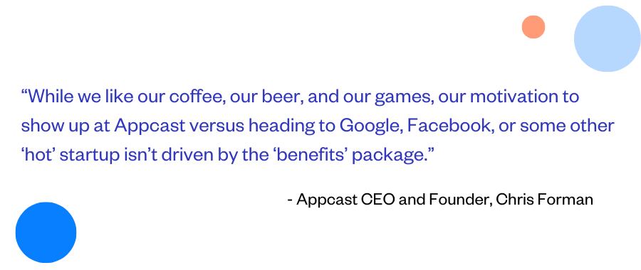 Our CEO and Founder Chris Forman sets a great example of what it means to put culture first. For instance, at our annual end of year meeting, the metrics that he is most proud to share are: number of first homes purchased by employees (in 2021 that number was 15), babies and grandbabies born (7), Appcastians married or engaged (18) and those who recently graduated (14). I can’t wait to hear what the new metrics will be later this year!